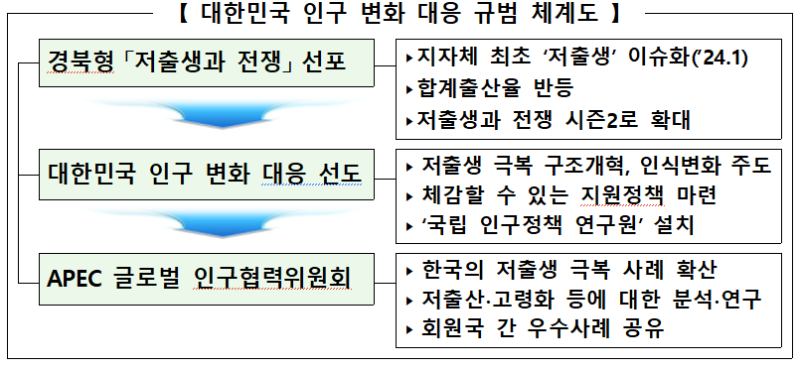 저출생·고령화 문제는 APEC 회원국 모두가 고민하고 해결해야 할 과제인 만큼 경북의 선도적 경험과 노하우가 아시아․태평양 지역 국가들에게도 큰 도움이 될 것으로 기대된다. 또한 APEC 국가들과 저출산․고령화에 대한 공동대응 및 협력을 위한 ‘국립 인구정책 연구원’의 경북 설치와 APEC산하 ‘APEC 글로벌 인구협력위원회’ 설립도 제안했다.