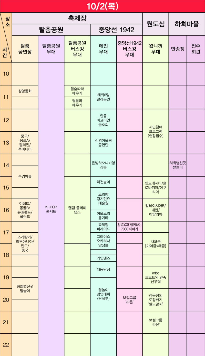 이날 오후 2시 30분에는 수영야류가 탈춤공연장 무대에 올라 남도 특유의 해학과 흥겨움을 전한다. 저녁 7시에는 같은 무대에서 유네스코 인류무형문화유산인 하회별신굿탈놀이가 공연돼, 한국 탈춤의 정수를 가까이서 만날 수 있다.