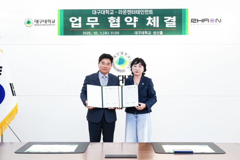 박재숙 라온엔터테인먼트 대표이사는 “이번 협약을 통해 대구대의 우수한 인재들이 현장에서 다양한 경험을 쌓을 수 있도록 적극적으로 지원하고, 실무 중심의 교육 협력을 통해 지역 사회에 기여할 수 있도록 최선을 다하겠다”고 말했다.