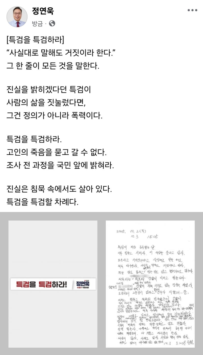 [서울경제TV 부산=김정옥 기자] 김건희 여사 관련 의혹을 수사하는 민중기 특별검사팀의 조사를 받은 경기 양평군 공무원이 숨진 것에 대해 정연욱 국민의힘 국회의원(부산 수영구)이 11일 자신의 SNS(사회관계망서비스)를 통해 “특검을 특검하라”며 특검의 책임을 에둘러 비판했다.