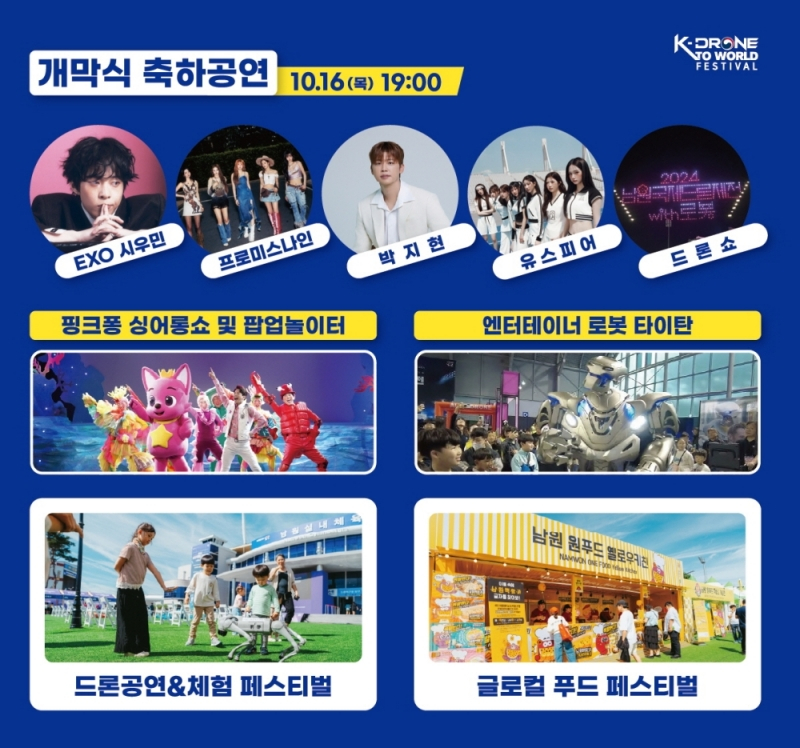 개막식은 16일 저녁, 화려한 드론 라이트쇼와 불꽃놀이로 축제의 서막을 연다. 밤하늘을 수놓는 환상적인 장면과 함께 EXO 시우민, 프로미스나인, 박지현, 유스피어 등 인기 K-POP 아티스트들의 무대가 이어져 축제의 열기를 한껏 끌어올릴 예정이다.