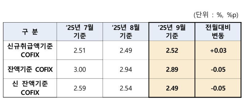 반면 잔액 기준 코픽스(9월말 잔액기준)는 전달 대비 0.05%p 낮아진 2.89%, 신 잔액기준 코픽스(9월말 잔액기준)도 전달 대비 0.05%p 하락한 2.49%를 기록했다.