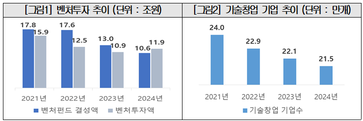 대한상의는 "국내 벤처투자액이 2021년 15조9000억원에서 2024년 11조9000억원으로 줄고 같은 기간 기술기반 창업기업 수도 24만개에서 21만5000개로 감소하고 있다"며, "민간자금 유입을 위해 벤처투자 세제혜택 확대를 건의한다"고 밝혔다.