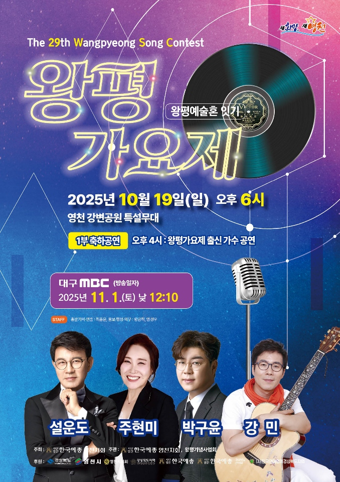 올해로 29회를 맞은 왕평가요제는 영천 출신 문인 겸 작곡가 왕평(이응호) 선생의 예술정신을 기리고, 실력 있는 신인 가수 발굴 및 지역 문화예술 활성화를 도모하기 위한 행사다.