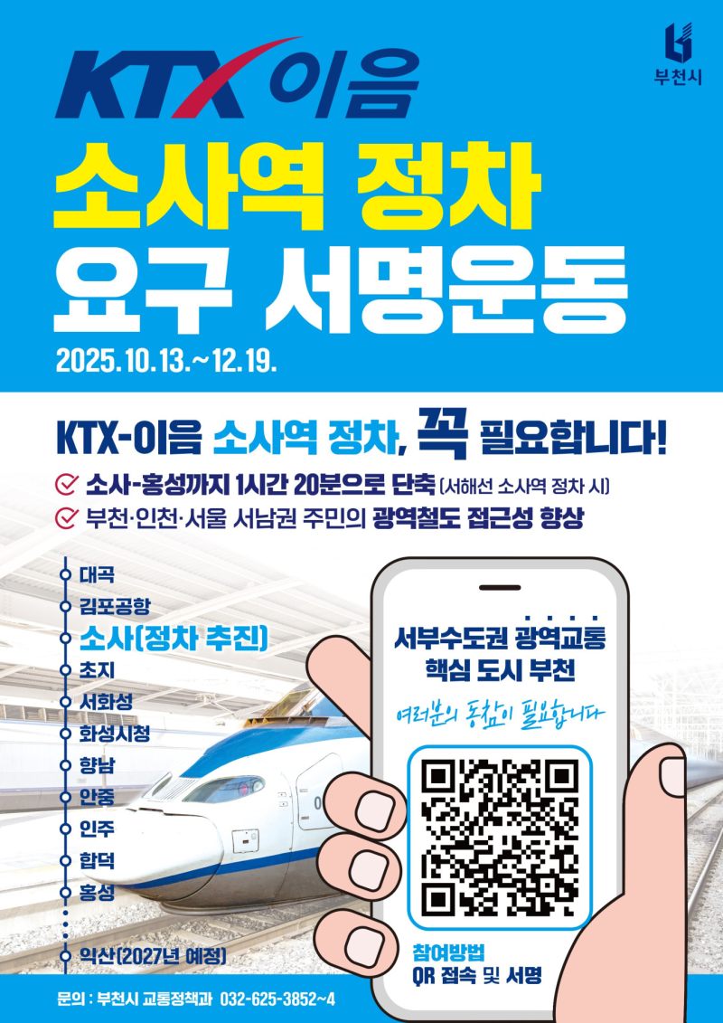 [서울경제TV 인천=김혜준 기자] 부천시가 서해선 KTX-이음 열차의 소사역 정차를 추진하기 위한 대규모 시민 서명운동에 나섰다.
