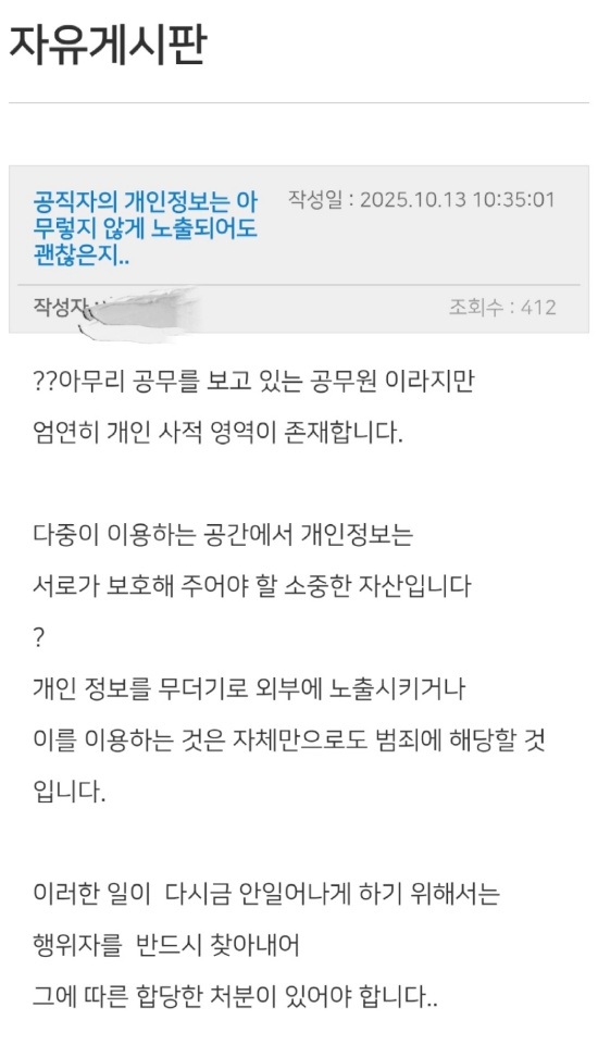 처음에는 공무원 몇 사람에 한정된 것으로 알고 있었으나 해당 글에 대한 피해를 호소하는 직원들의 댓글이 80여 건 올라오면서 사태의 심각성이 커지는 모양새다.