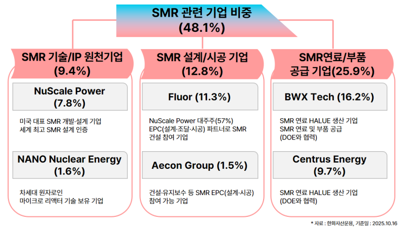 포트폴리오로는 SMR 기술 IP등 원천기술을 보유한 뉴스케일파워(7.8%), 나노뉴클리어에너지(1.6%), SMR을 실제 건설하고 핵심기자재를 납품하는 BWX테크(16.2%), 플루오르(11.3%), 에이콘그룹(1.5%), SMR의 연료가 되는 HALEU(고농축우라늄)를 독점 공급하는 센트러스에너지(9.7%) 등이다
