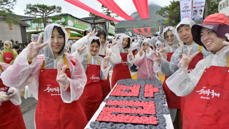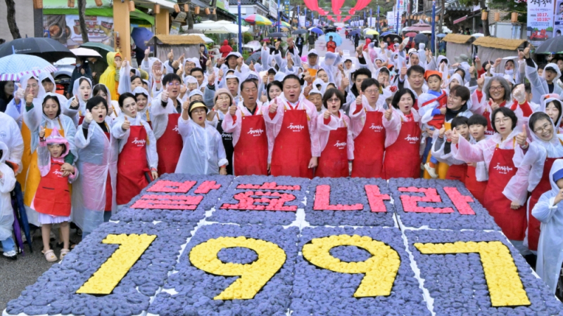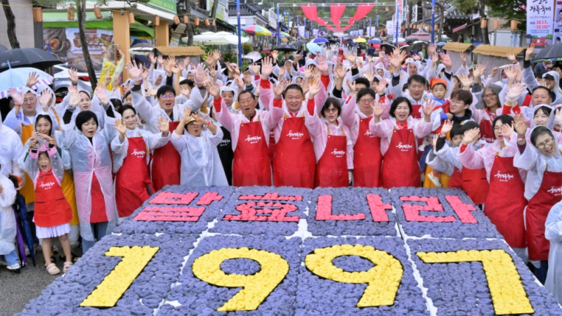 1997년 민속마을 조성의 의미를 되새기며, 참가자들이 간장·고춧가루·메주가루를 상징하는 검정·빨강·노랑 가래떡으로 글씨를 만드는 퍼포먼스를 펼쳐 눈길을 끌었다. 가족 단위 관람객들은 함께 참여하며 전통 발효문화의 상징성과 즐거움을 체험했다. [사진=순창군]