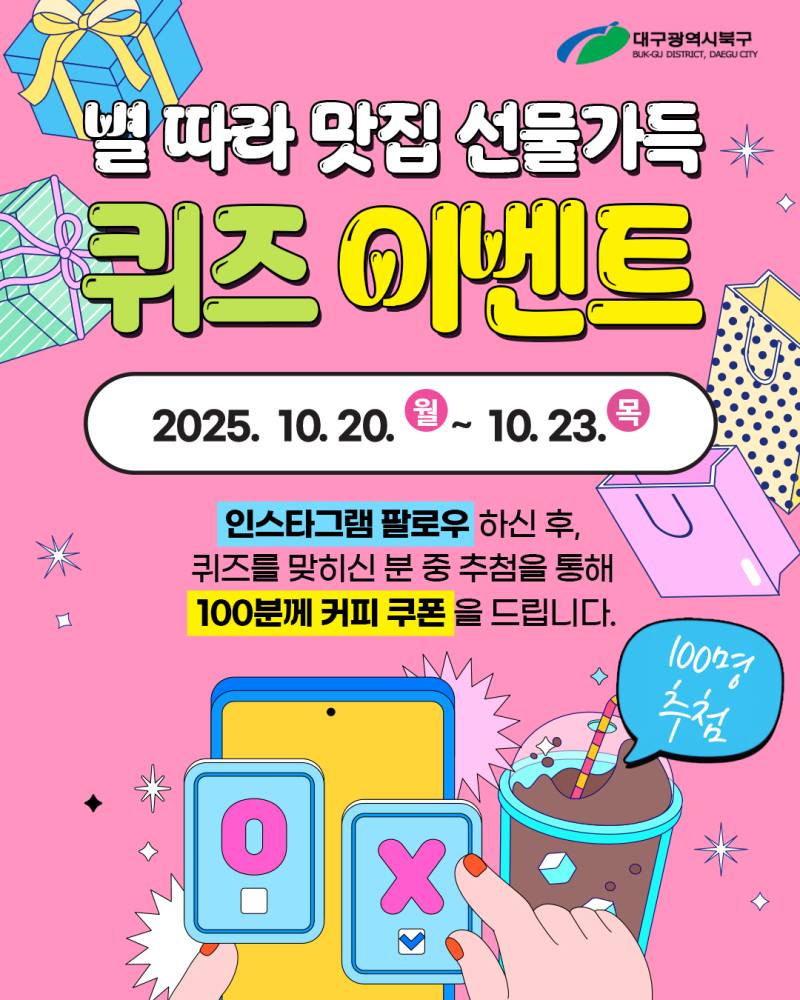먼저 퀴즈 이벤트는 10월 20일부터 23일까지 ‘대구북구맛집’ 홈페이지(dgbukfood.co.kr)를 통해 참여할 수 있다. 이벤트 기간 동안 퀴즈에 참여하고 ‘대구북구맛집’ 인스타그램을 팔로우한 정답자 중 100명을 추첨해 모바일 상품권(5천원 상당)을 지급한다.
