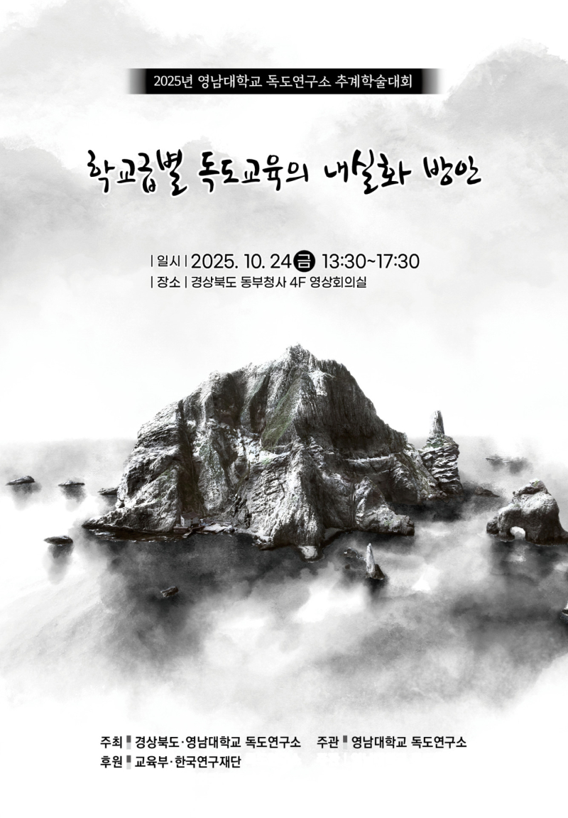 [서울경제TV 대구=김정희 기자] 영남대학교(총장 최외출) 독도연구소는 경상북도와 공동으로 24일 오후 경상북도 동부청사 4층 영상회의실에서 ‘학교급별 독도교육의 내실화 방안’을 주제로 학술대회를 개최한다.