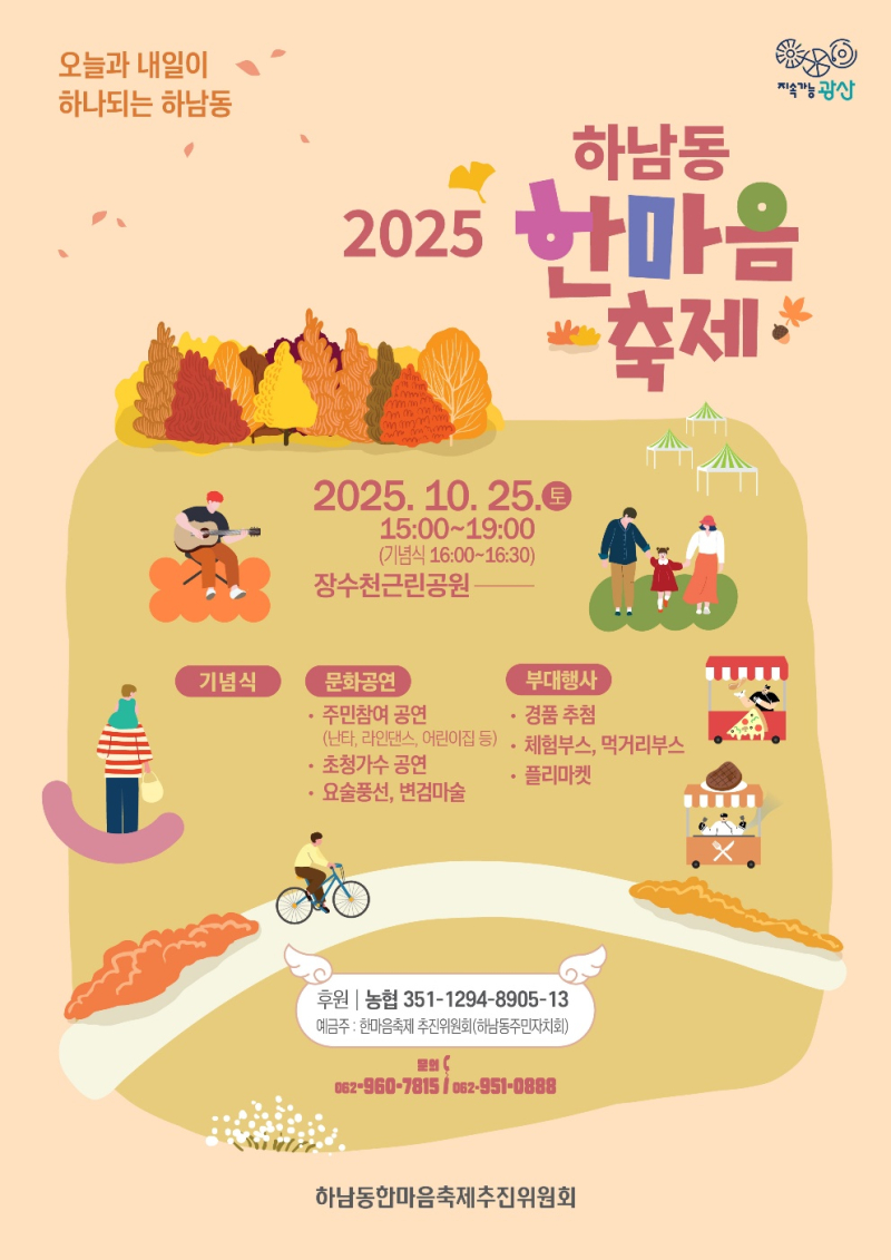 22일 '광산구 하남동한마음축제추진위원회'(이하 '한마음축제추진위')에 따르면 '한마음축제추진위'는 25일 오후 3시~7시까지 광산구 산정동 장수천근린공원에서 '오늘과 내일이 하나되는 하남동'이라는 슬로건 아래 '2025 하남동 한마음 축제'를 연다.
