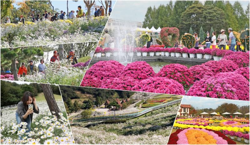 테마파크 내 바람의 언덕과 구절초 동산에서는 새하얀 구절초와 형형색색 국화꽃이 어우러져, 소나무 숲과 함께 한 폭의 수채화를 연상케 하는 풍경을 만들어낸다.