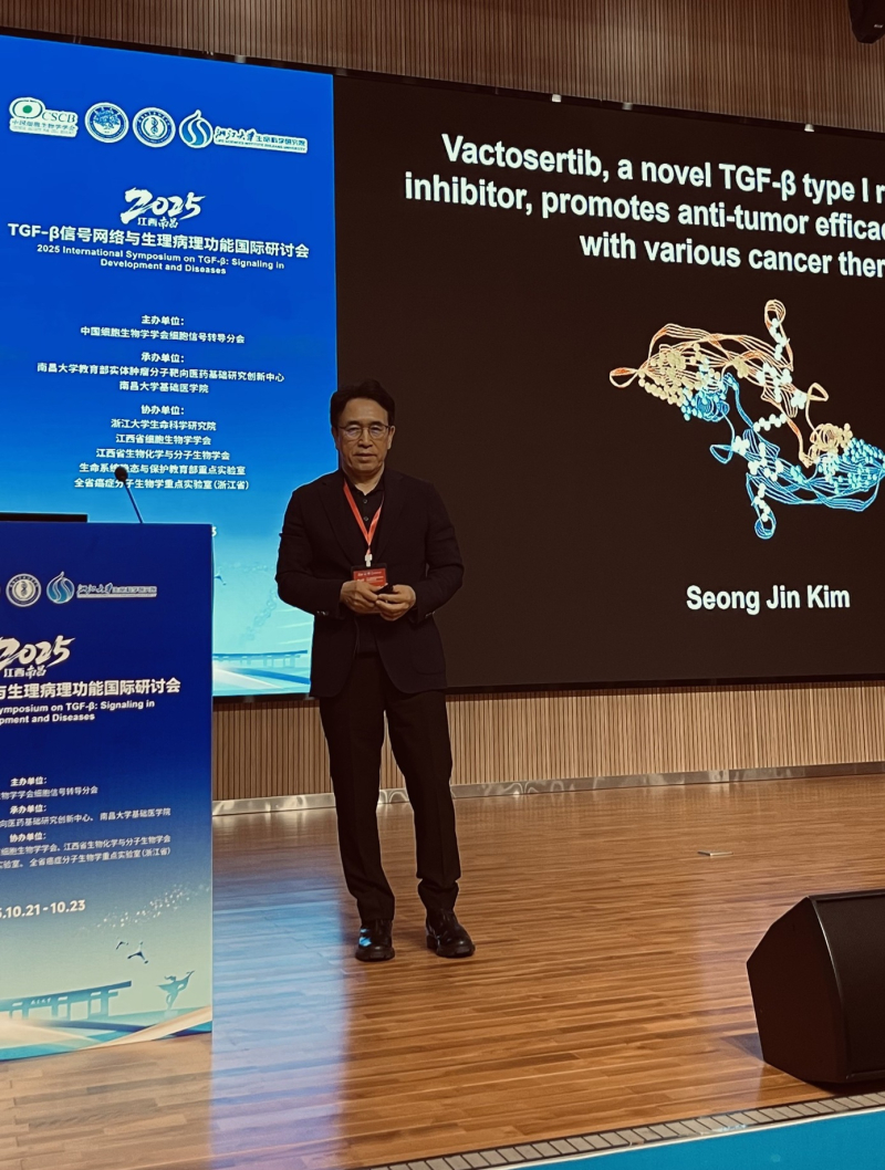 이번 행사에는 TGF-β(형질전환증식인자 베타) 분야의 세계적 석학이기도 한 김성진 메드팩토 대표가 주요 연사로 초청받아 '종양 미세환경을 조절하는 TGF-β 억제제의 임상 개발 현황'이라는 주제로 발표했다.