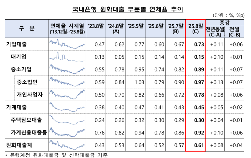 부문별로 8월 말 기준 기업대출 연체율은 0.73%로 전월말(0.67%) 대비 0.06%p 상승했다.