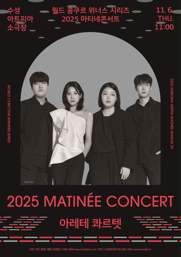 [서울경제TV 대구=김정희 기자] (재)수성문화재단 수성아트피아(이사장 김대권)는 2025년 11월 6일(목) 오전 11시, 소극장에서 ‘월드 콩쿠르 위너스 시리즈’ 여섯 번째 무대로 현악사중주단 아레테 콰르텟을 초청한다.