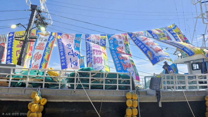 참석자들은 선체에 내걸린 축하 현수막과 만선기를 보며, 한때 항구마다 만선기가 펄럭이던 시절을 회상하며 담소를 나눴다.