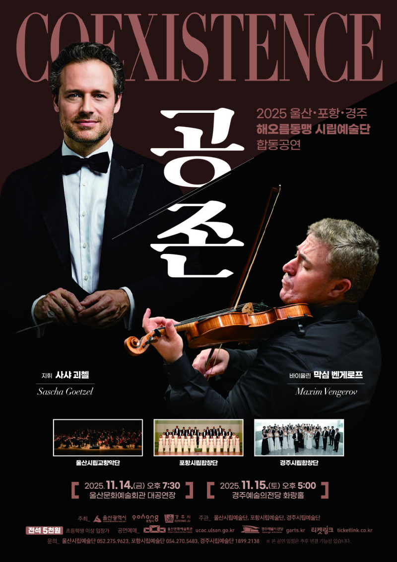 [서울경제TV 경주=김아연 기자] 울산광역시가 주관하는 ‘2025 해오름동맹 시립예술단 합동공연 <공존(COEXISTENCE)>’이 11월 14일 울산문화예술회관 대공연장, 11월 15일 경주예술의전당 화랑홀에서 잇따라 열린다.