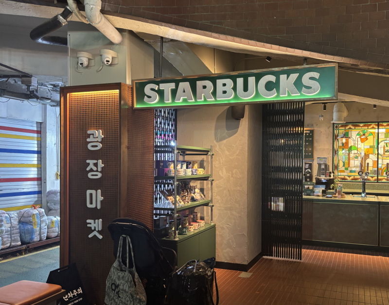 뿐만 아니라, 지난 5월에는 스타벅스까지 입점했다. 역 근처가 아닌 시장이라는 이색적인 입지로 오픈 당일 방문자수 2000명을 기록하며 SNS를 뜨겁게 달군 스타벅스 광장시장점은 인증샷 명소로 자리 잡았다. 시장 중심부에 위치한 스타벅스는 지상 1~2층과 루프탑으로 이뤄졌다.