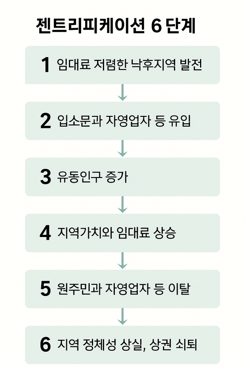 젠트리피케이션은 낙후했던 구도심이 번성해 사람들이 몰려 임대료가 오르면서 원주민이 밀려나는 현상이다. 통상 젠트리피케이션은 ‘저렴한 임대료의 낙후지역 발전→입소문→유동인구 증가→임대료 상승→원주민과 자영업자 이탈→상권 쇠퇴’ 순으로 진행된다.