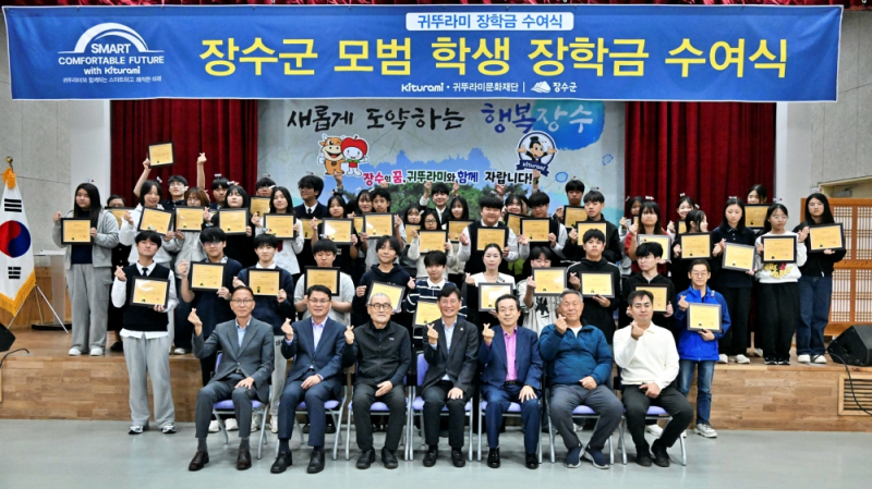 [서울경제TV 장수=최영 기자] 전북 장수군은 지난 24일 군청 군민회관에서 '2025년 귀뚜라미문화재단 장수군 모범학생 장학금 수여식'을 열고 지역 중·고등학생 50명에게 총 5,000만 원의 장학금을 전달했다고 밝혔다.