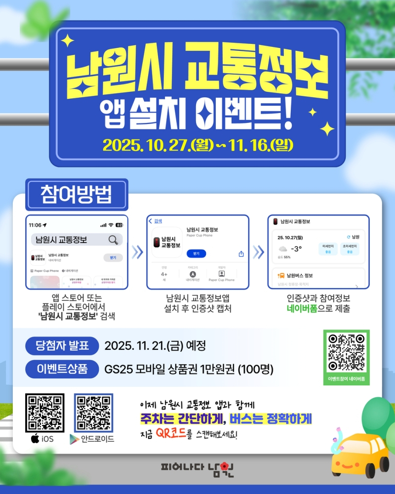 이번 이벤트는 남원시 교통정보 앱을 설치한 후 인증사진을 남원시 공식 SNS(인스타그램, 페이스북)에 업로드하면 참여할 수 있다. 10월 27일부터 11월 16일까지 3주간 진행되며, 추첨을 통해 100명에게 편의점 모바일상품권이 증정된다.