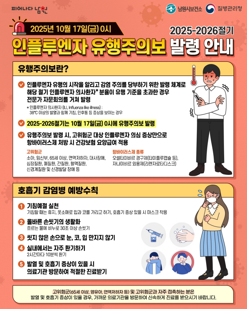 남원시는 "고위험군은 본격적인 유행 전 반드시 예방접종을 완료하고, 발열이나 인플루엔자 증상이 있을 경우 신속히 진료를 받아야 한다"며 기침 예절, 손 씻기, 실내 환기 등 호흡기 감염병 예방수칙 준수를 강조했다.