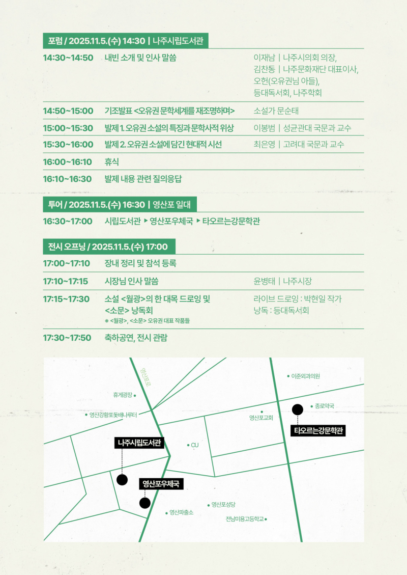 나주문화재단은 행사 당일 작가의 생애가 깃든 영산포 일대를 걷는 '오유권 문학 투어'를 진행한다. 영산포우체국 등 작가의 흔적이 남은 장소를 둘러보며 지역 문학의 현장을 직접 체험할 예정이다.