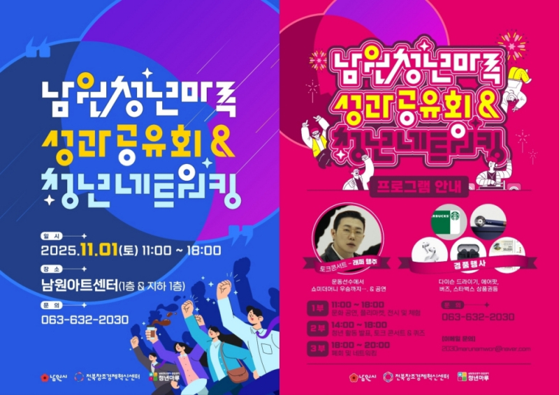 이번 행사는 남원 청년마루를 중심으로 추진된 다양한 사업의 결과를 돌아보고, 청년들이 서로의 경험을 나누며 협력의 기회를 모색하는 자리로 마련됐다. '남원 청년의 도전과 성장'을 주제로 청년과 시민이 함께 참여하는 열린 축제로 진행된다.