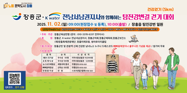 이번 행사는 장흥군육상연맹이 주최와 주관을 맡았으며 참가비 없이 누구나 현장에서 접수해 자유롭게 참여할 수 있다. 탐진강변길 걷기대회는 탐진강의 수려한 자연경관을 따라 걸으며 건강과 힐링을 동시에 챙길 수 있는 가족 친화형 행사로 마련됐다.