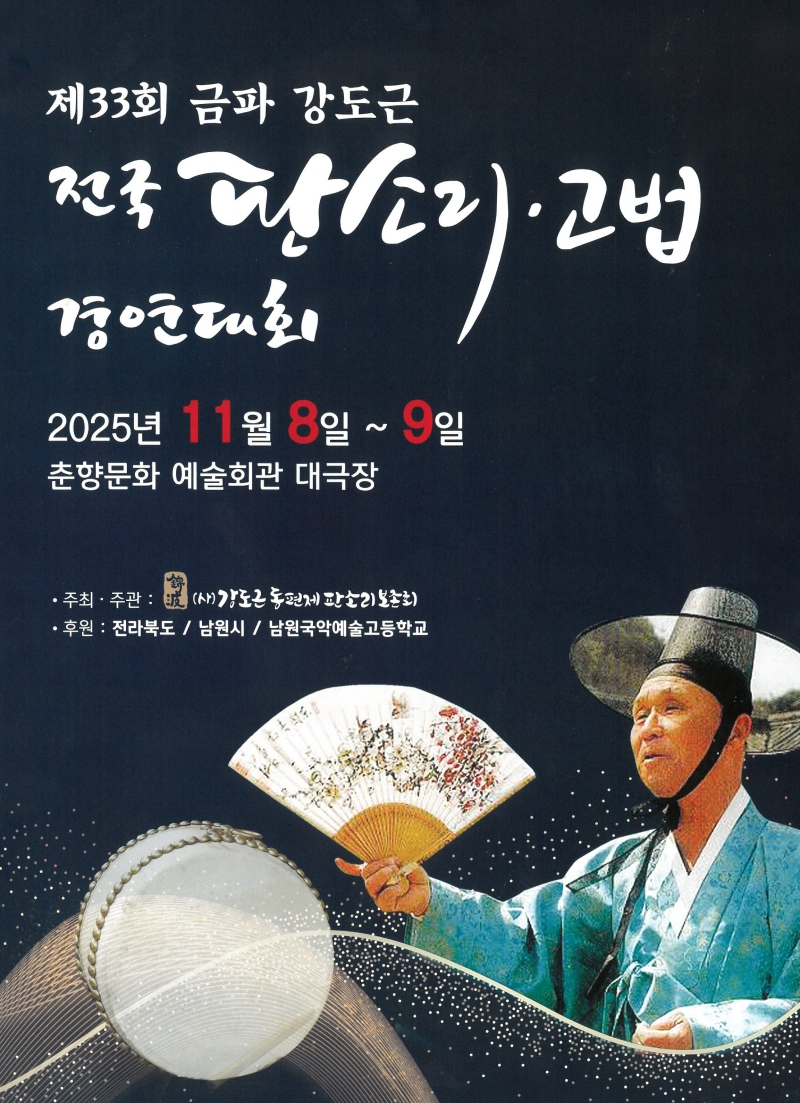 [서울경제TV 남원=최영 기자] 국악의 고장 남원에서 '제33회 금파 강도근 전국 판소리·고법 경연대회'가 오는 8일부터 9일까지 이틀간 춘향문화예술회관에서 열린다.