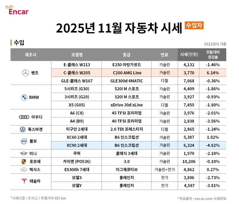 [서울경제TV=이채우 인턴기자] 엔카닷컴은 2025년 11월 중고차 시세를 4일 밝혔다.