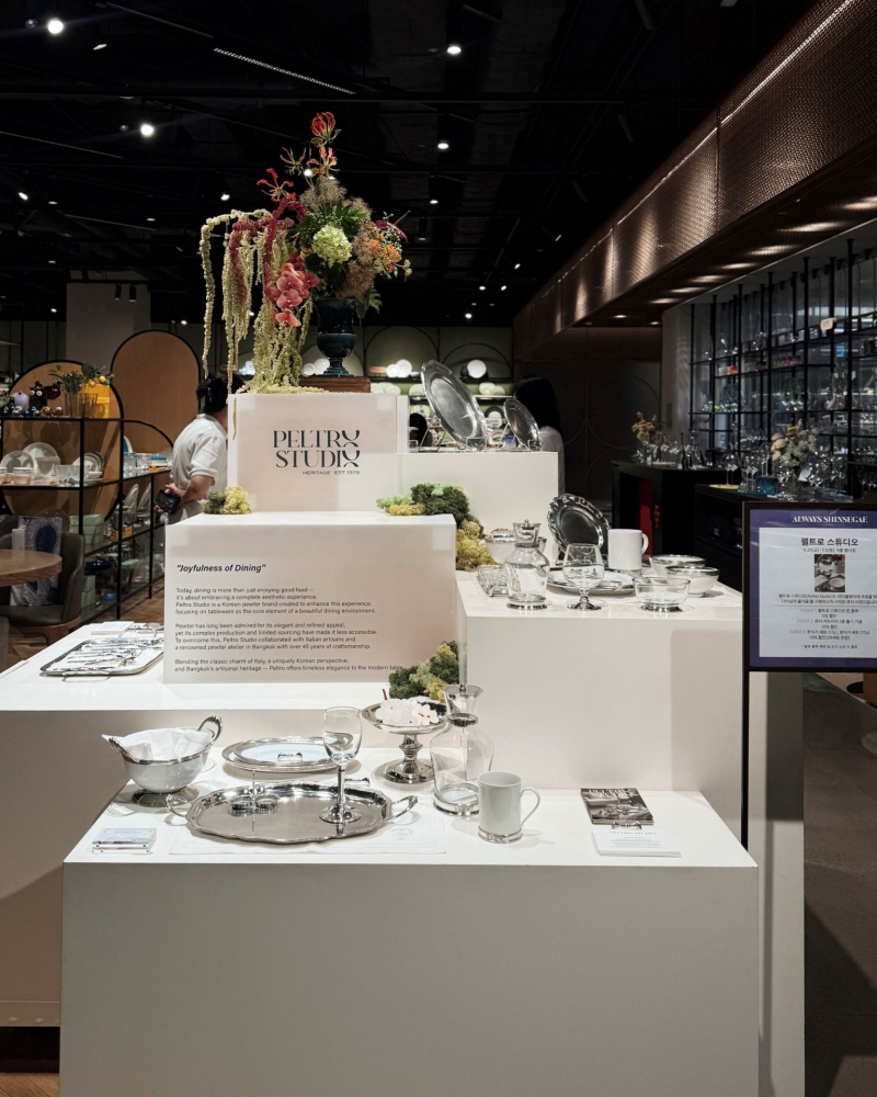 펠트로 스튜디오는 95% 이상의 퓨터가 함유된 리얼 퓨터로 몰딩 제작부터 주물 제작, 연마까지 모든 과정을 프랑스의 숙련된 장인과의 교류를 통해 방콕 아티산의 수작업으로 완성한다. 이번 팝업에서는 장인의 손끝으로 완성된 퓨터 식기를 중심으로 테이블의 품격과 완성도를 더한 테이블웨어를 소비자에게 가장 가까이에서 경험할 수 있도록 선보였다.