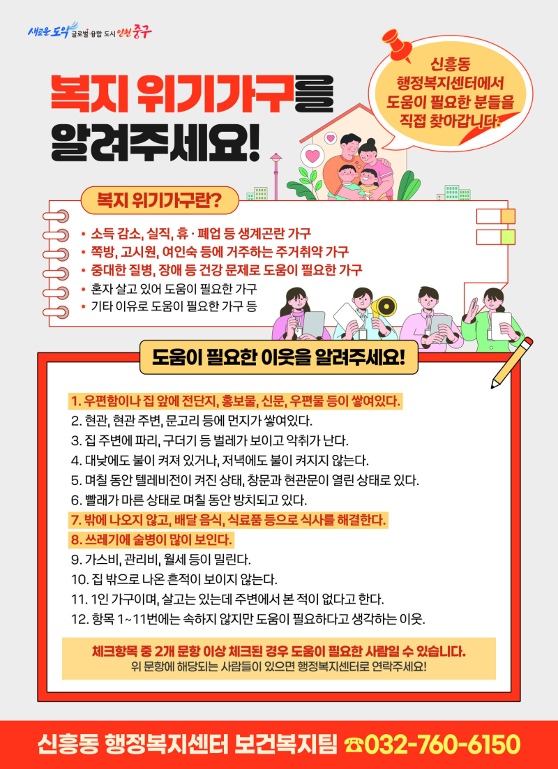구에 따르면, 자체 제작한 포스터를 동 곳곳과 공동주택, 지구대 등 관내 관계 기관에 게시하고, 명예사회복지공무원과 지역사회보장협의체를 활용해 위기가구를 발굴할 계획이라고 전했다.