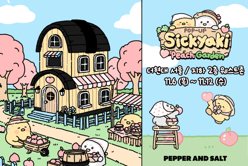 [서울경제TV=오동건 인턴기자] 페퍼앤솔트는 인기 디지털 크리에이터 ‘병약이(sick_yaki)’와 손잡고 오는 12일까지 팝업스토어 ‘Sickyaki Peach Garden’을 연다고 6일 밝혔다.