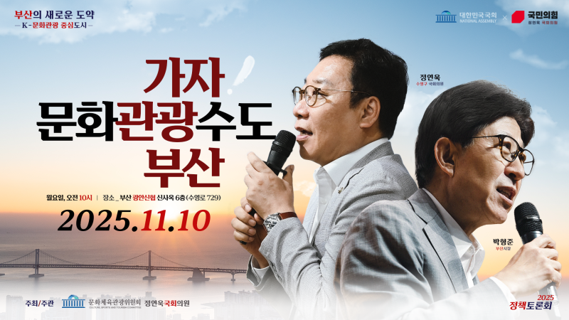 2부는 정연욱 의원이 좌장을 맡아 ‘문화관광수도 부산, 시민과 시장을 잇다’를 주제로 진행된다. 이 자리에서 박형준 시장이 참석해 부산시민과 관광 교육 연계, 지역 가게 활성화 방안, K-콘텐츠 산업 연계 구조, 경제 효과 및 청년 일자리, 먹거리 신뢰 제도, 해안·시장·수변 공간을 잇는 관광 동선 정비, 교통·숙박 편의 인프라 개선, 재방문 기반 데이터 정책 등에 대해 시민들과 의견을 나눌 예정이다.