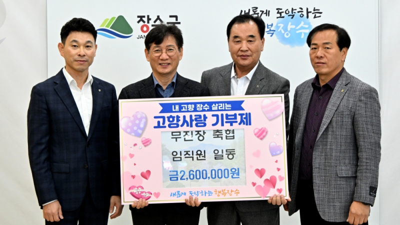 최훈식 장수군수는 "매년 잊지 않고 고향사랑기부에 함께해주신 무진장축협 임직원 여러분께 깊은 감사를 드린다"며 "소중한 기부금은 군민 복지와 지역 발전에 의미 있게 사용해 더 살기 좋은 장수를 만들어 가겠다"고 밝혔다.