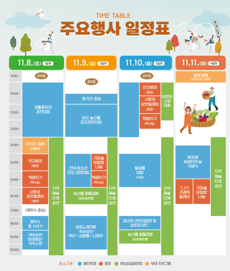 또한 농업인의 날 제정 기념탑이 있는 단관공원에서는 '삼토제례'가 열려 흙과 농업의 소중함을 되새긴다. 도내 18개 시군이 참여하는 농특산물 홍보관과 농기계 전시관, 분재·국화·천연염색 작품 전시 등 볼거리도 풍성하다.