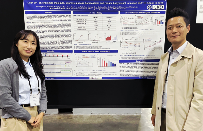 4일 미국 애틀란타에서 열린 ‘2025 미국비만학회(2025 Obesity Week)’에서는 경구용 GLP-1 수용체 작용제(GLP-1RA) 신약 후보물질 ‘CKD-514’의 비임상 연구 성과를 발표했다. CKD-514는 용해도 개선을 통한 구조적 이점을 바탕으로 대동물 모델에서 우수한 경구 생체이용률(Dog BA)을 보였으며, 경구용 비만치료제 오포글리프론(Orforglipron) 대비 적은 용량에서 유의한 체중 감소 효과와 동일 용량 대비 우수한 혈당 강하 효과를 나타냈다. CKD-514의 후속 화합물군 역시 오포글리프론과 세마글루타이드(Semaglutide)와의 비교 시험에서 두 약물과 동등하거나 우월한 대사 개선 효과가 있음을 확인했다. 복용 편의성이 높은 경구 제형 비만치료제 개발에 성공한다면, 주사형 비만 치료제가 주류를 이루는 글로벌 시장에서 차별성과 경쟁력을 확보할 것으로 기대된다.