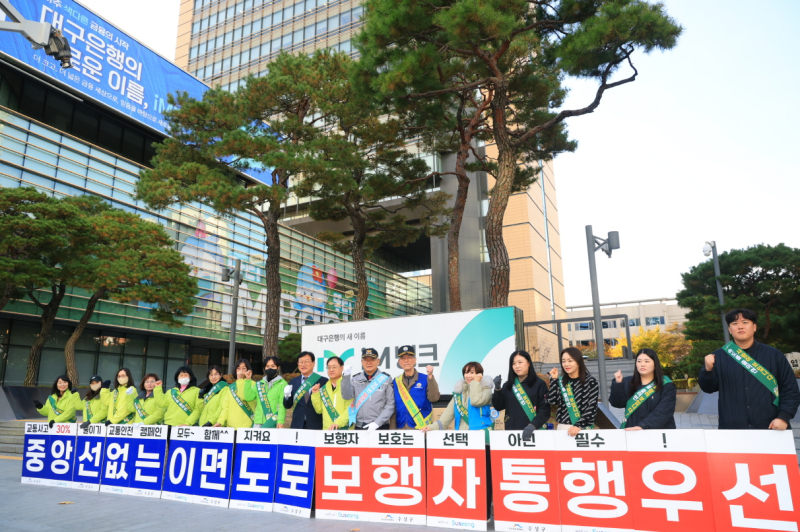 이번 캠페인은 11월 둘째 주 ‘보행안전주간’과 11월 11일 ‘보행자의 날’을 맞아 진행됐으며, 김대권 수성구청장과 최미섭 수성경찰서장을 비롯해 수성구청 교통과, 교통봉사단체 수성구 보행지킴이, 퇴직 경찰관으로 구성된 봉사단체인 수성재향경우회 회원 등 60여 명이 참여했다.