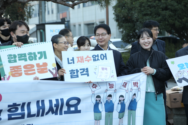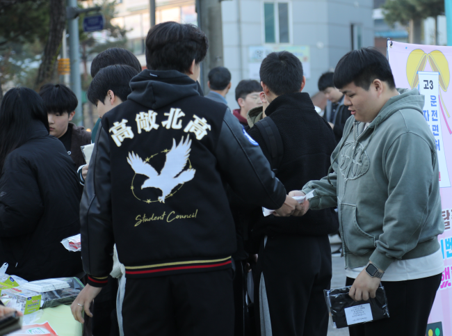 이날 오전 7시 40분 전북 고창고등학교 수험생 응원 현장에는 심덕섭 고창군수와 고창군 장학재단 관계자 및 고창관내 후배들이 핫팩과 점심 등을 나눠주면서 시험 잘 치르라는 격려를 아끼지 않았다./kddml85@sedaily.com