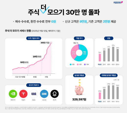 이번 30만 고객 달성을 기념해 키움증권은 ‘주식 더 모으기’ 고객들의 투자 패턴을 다시 한번 공개했다. 월평균 적립금액, 가장 많이 적립한 종목 TOP 5, 연령·금액대별 특징 등 다양한 지표를 통해 고객들의 실제 투자 성향을 확인할 수 있다. (분석 기간: 2025.2.20 ~ 2025.11.10, 해외 기준)