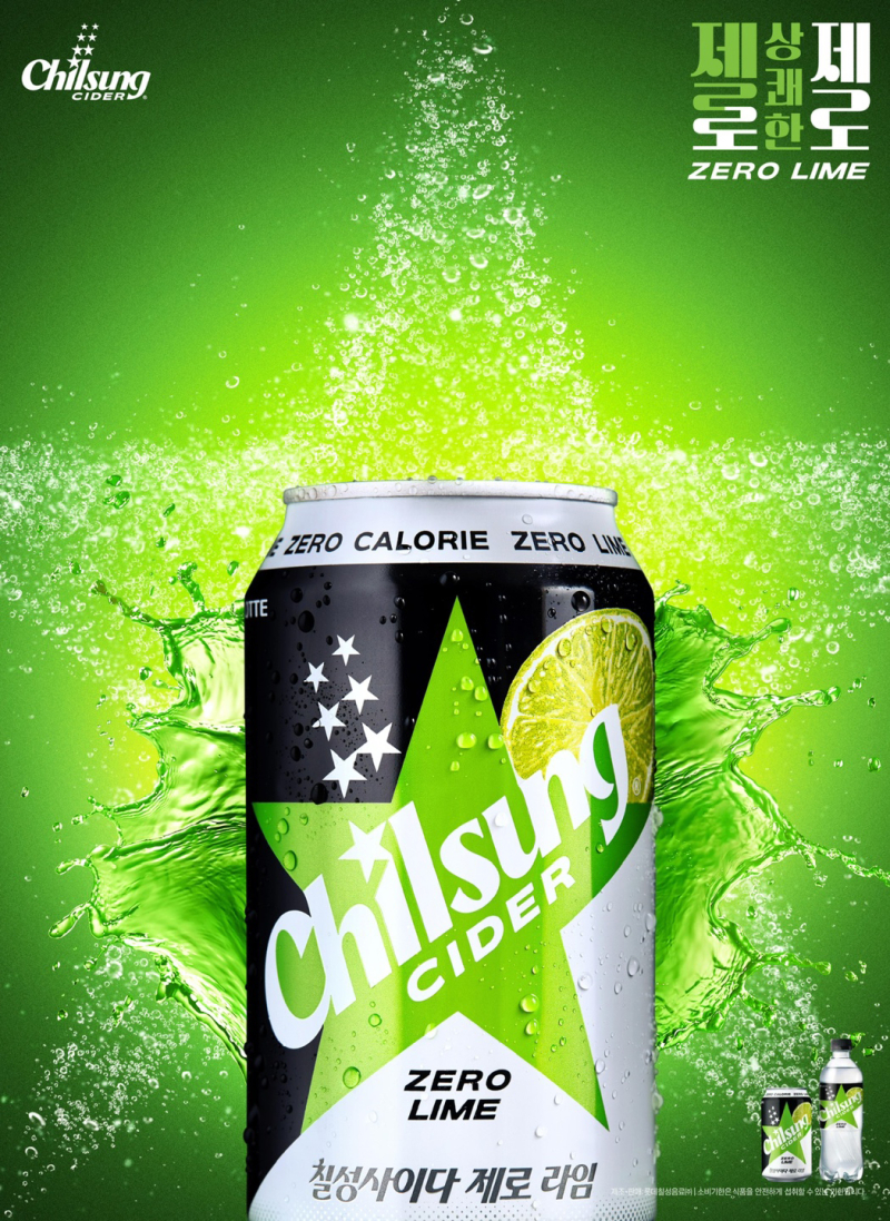 제품 패키지는 칠성사이다 고유 디자인을 유지하면서 라벨 중앙에 연두색 컬러의 별 엠블럼과 라임 이미지를 담았고, 제로 라임(ZERO LIME)이라는 제품 네이밍을 통해 라임향과 제품 속성을 소비자들이 보다 직관적으로 인지할 수 있도록 표현했다.