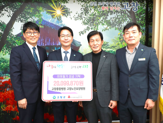14일 고창군에 따르면 지난 13일 총 2110만원 상당의 이웃돕기성금을 전달받았다. 이번 기탁식에서 조남열 고창종합병원 이사장은 2009만 9870원의 성금을 기탁했고, 강형철 고창군어린이집연합회도 이웃돕기 성금 100만 원을 전달했다.