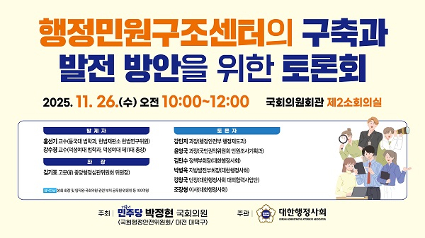 좌장은 김기표 전 중앙행정심판위원회 위원장이 맡으며, 토론에는 강민지 과장(행정안전부 행정제도과), 윤영국 과장(국민권익위원회 민원조사기획과), 김민수 정책부회장(대한행정사회), 박병옥 지방발전부회장(대한행정사회), 강창국 단장(대한행정사회 대외협력사업단), 조장형 이사(대한행정사회)가 참여한다.