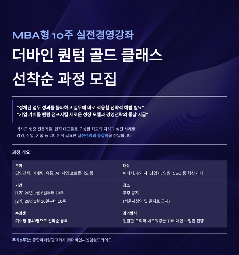 [서울경제TV=정창신기자] 인공지능(AI)과 ESG, 신사업 전환의 흐름 속에서 새로운 리더십과 경영전략이 요구되는 가운데, 실무 중심의 MBA형 경영 강좌 ‘더바인 퀀텀 골드 클래스’가 개설된다. 19일 종합마케팅광고회사 더바인씨엔엠월드와이드에 따르면 이번 과정은 내년 1월에 개강하는 1기와 2기를 선착순 40명으로 동시 모집한다.