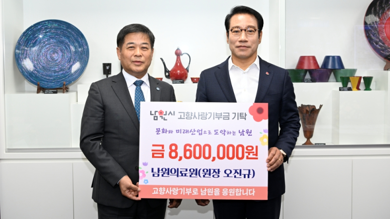 남원의료원은 21일 오전, 진안의료원과의 200만 원 상호기부에 이어 직원들이 자발적으로 모은 860만 원을 추가 기탁하며, 올해 총 1,060만 원의 고향사랑기부금을 남원시에 전달했다.