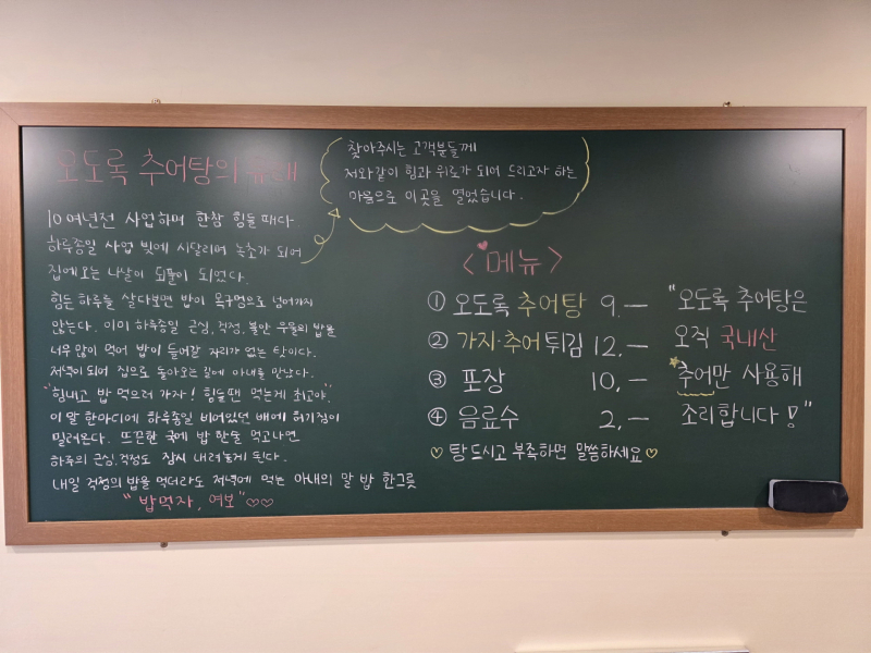 또 하나의 차별점은 ‘스토리가 있는 음식점’이라는 정체성이다. 메뉴판에는 오도록추어탕이 탄생한 과정, 대표가 어떤 마음으로 음식을 만드는지에 대한 글이 담겨 있다. 테이블마다 놓인 짧은 문장에도 한 그릇의 밥이 누군가에게 건네는 힘과 위로를 담았다.