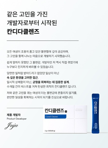 ‘칸디클렌즈’는 미생물 균주를 20년간 연구해 온 전문 연구원이 미생물 전문 연구소에서 직접 균주를 채취해 개발한 원료인 ‘바이오 필’을 바탕으로, Y존 관리를 위한 천연 유래 시너지 조합으로 설계된 제품이다.