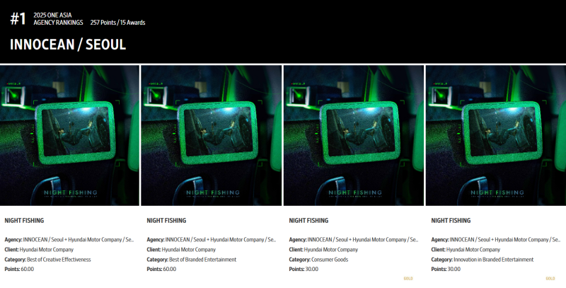 현대자동차와 이노션이 공동 기획한 단편 영화 '밤낚시'는 이번 광고제에서도 작품성과 혁신성을 모두 인정받아 브랜디드 엔터테인먼트, 크리에이티브 효과성 부문 등에서 '최고상(Best of Discipline)'을 포함해 여러 주요 부문에서 수상했다. 최고상 외에도 금상 2개 등 총 12개 수상을 기록하며 전체 출품작 중 가장 높은 점수를 획득한 '올해의 최고 캠페인'으로 선정됐다.