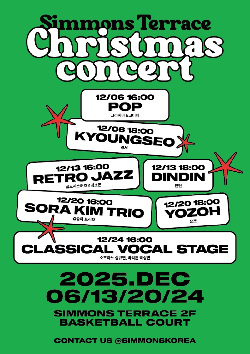 이번 크리스마스 콘서트는 시몬스 테라스 2층 바스킷볼 코트에서 12월 6일·13일·20일·24일 총 4일에 걸쳐 열린다. 6일·13일·20일에는 오후 4시와 6시 두 차례, 24일에는 오후 4시 한 차례 진행된다.